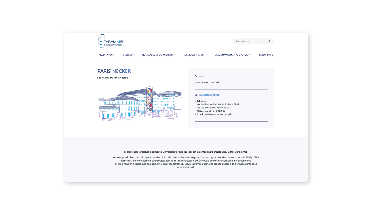 Le CRMR Carammel est un réseau national coordonné par un centre coordonnateur basé à Paris. Dédié à la prise en charge des maladies mitochondriales de l’enfance à l’âge adulte, l'objectif du site consiste à informer les patients et leur entourage.