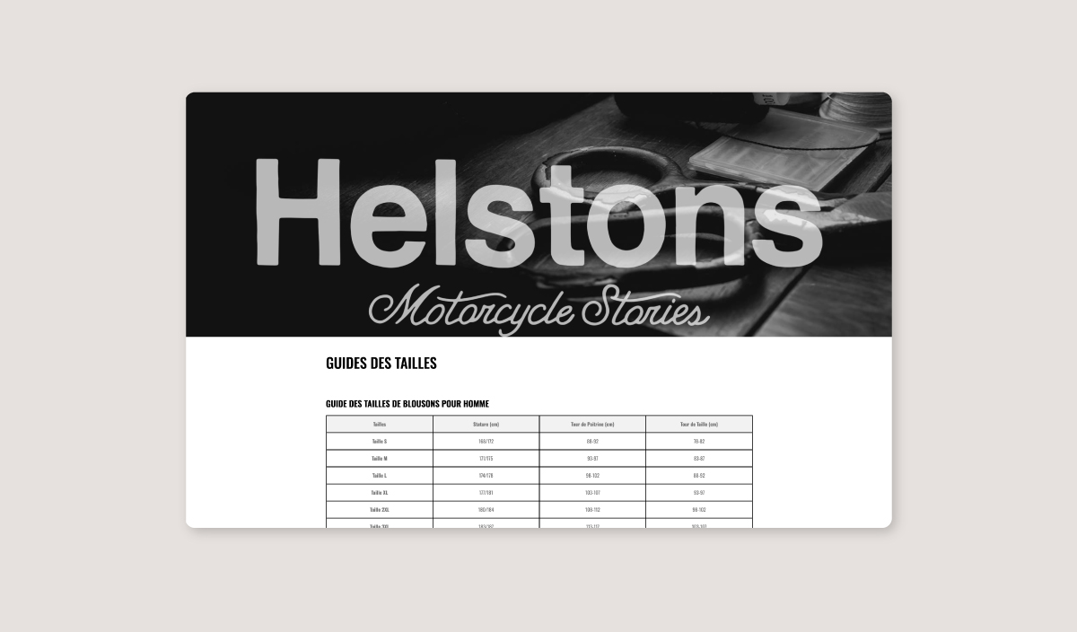 Helstons est une célèbre marque de vêtements et d'accessoires moto. Dans le cadre de notre mission, l'objectif était de présenter aux professionnels le catalogue complet avec toutes les options possibles des produits.